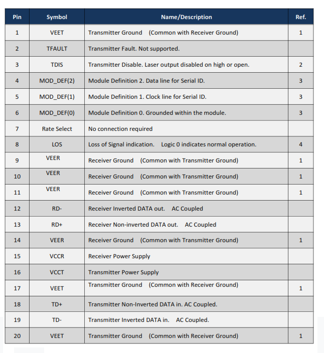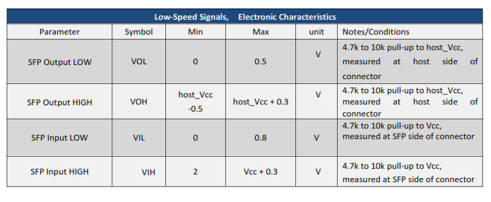 C. Should be pulled up with 4.7k - 10k Ohms on host board to a voltage between 2.0 V and 3.6 V. MOD_DEF(0) pulls line low to indicate module is plugged in.